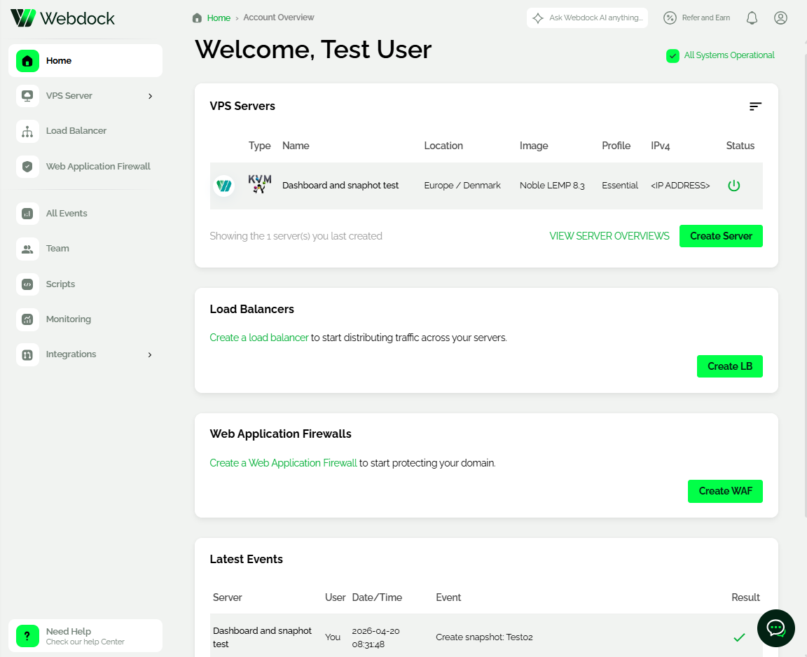 The Webdock dashboard provides a centralized interface for managing servers, networking components, security features, and operational activity. It enables efficient control and visibility across your infrastructure from a single workspace.