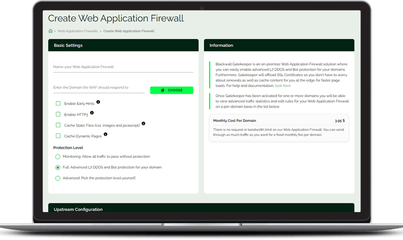 Web Application Firewall – powered by Blackwall – is our on-premise WAF solution where you can easily enable advanced L7 DDOS and Bot protection for your domains. Furthermore, Gatekeeper can offload SSL Certificates so you don't have to worry about renewals as well as cache content for you at the edge for faster page loads.