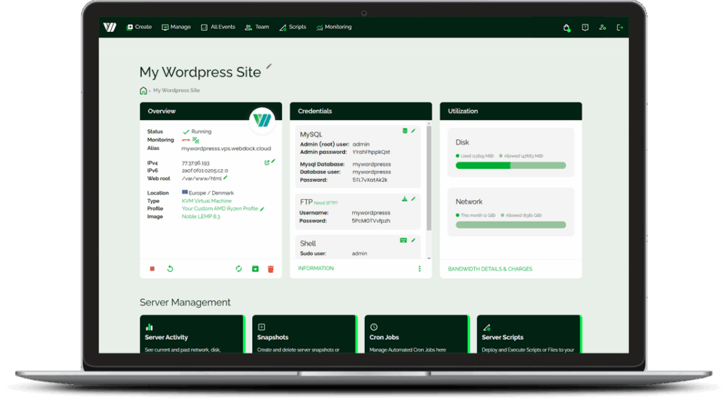 Once you spin up a Webdock Web Server, you can easily install WordPress in a few steps: